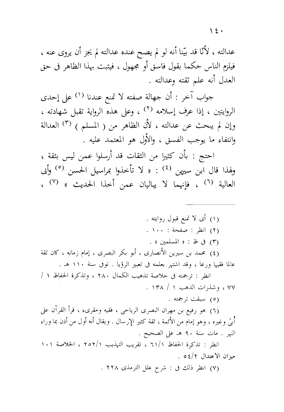 جواب آخر: أن جهالة صفته لا تمنع عندنا على إحدى الروايتين، إذا عرف إسلامه، وعلى هذه الرواية تقبل شهادته، وإن لم يبحث عن عدالته، لأن الظاهر من (المسلم) العدالة وانتفاء ما يوجب الفس ٥ ق، والأول هو المعتمد عليه.