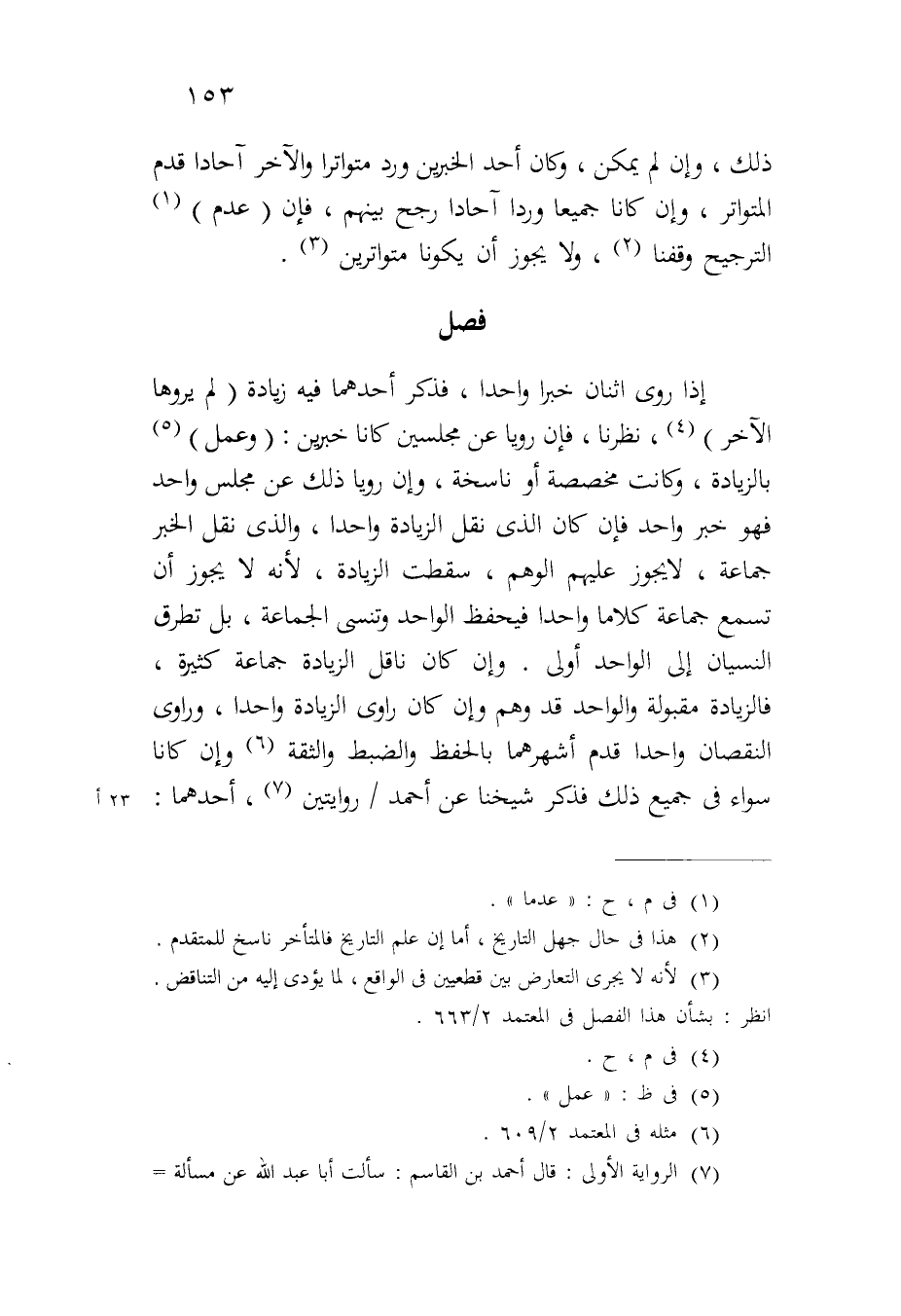 إذا روى اثنان خبراً واحداً، فذكر أحدهما فيه زيادة (لم يروها الآخر)، نظرنا، فإن رويا عن مجلسين كانا خبرين: (وعمل) بالزيادة، وكانت مخصصة أو ناسخة، وإن رويا ذلك عن مجلس واحد فهو خبر واحد فإن كان الذي نقل الزيادة واحداً، والذي نقل الخبر جماعة، لا يجوز عليهم الوهم، سقطت الزيادة، لأنه لا يجوز أن تسمع جماعة كلاماً واحداً فيحفظ الواحد وتنسى الجماعة، بل تطرق النسيان إلى الواحد أولى. وإن كان ناقل الزيادة جماعة كثيرة، فالزيادة مقبولة والواحد قد وهم وإن كان راوي الزيادة واحداً، وراوى النقصان واحداً قدم أشهرهما بالحفظ والضبط والثقة وإن كانا سواء في جميع ذلك فذكر شيخنا عن أحمد/ روايتين، أحدهما: