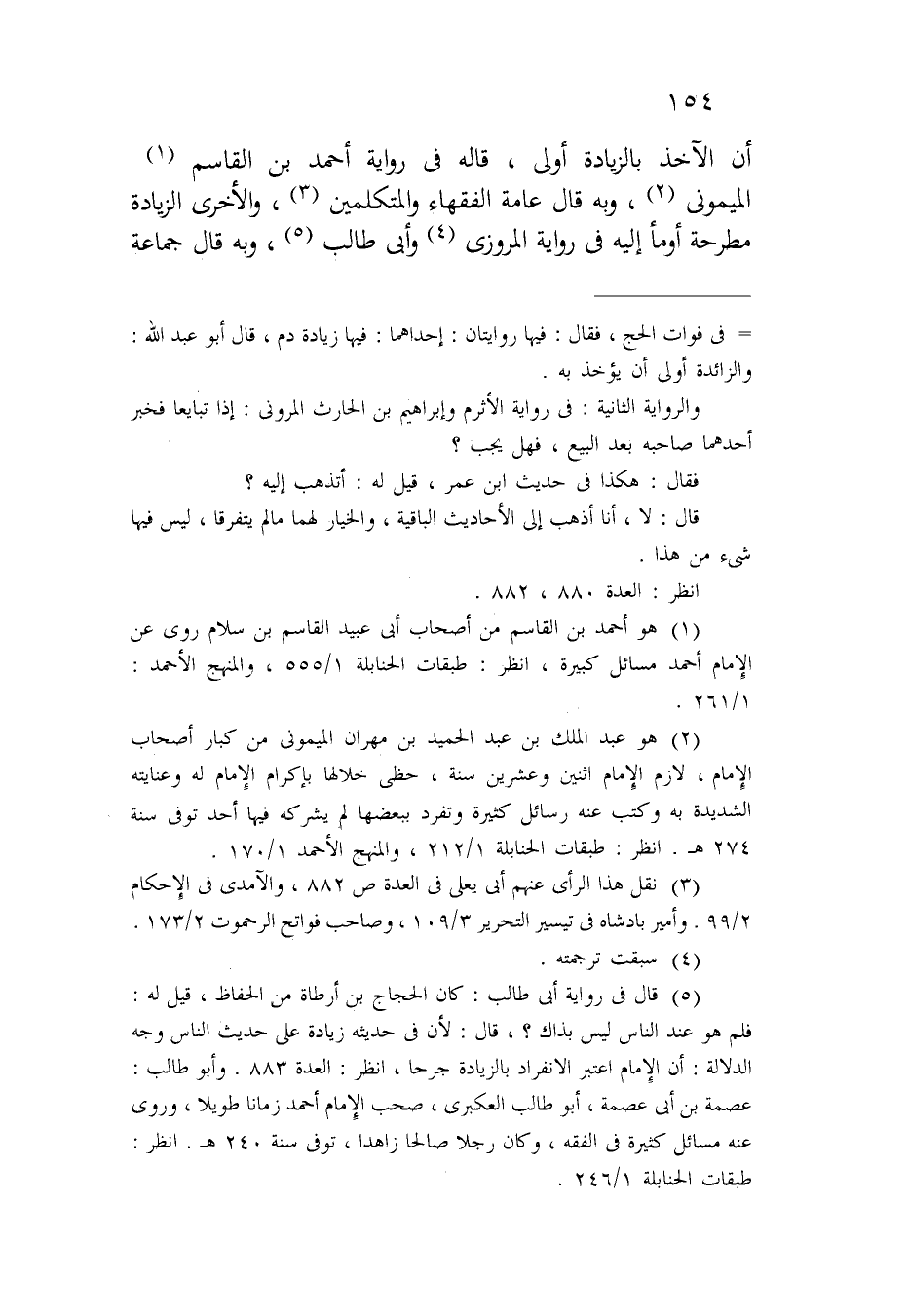 أن الآخذ بالزيادة أولى، قاله في رواية أحمد بن القاسم الميموني، وبه قال عامة الفقهاء والمتكلمين، والأخرى الزيادة مطرحة أومأ إليه في رواية المروزي وأبي طالب، وبه قال جماعة