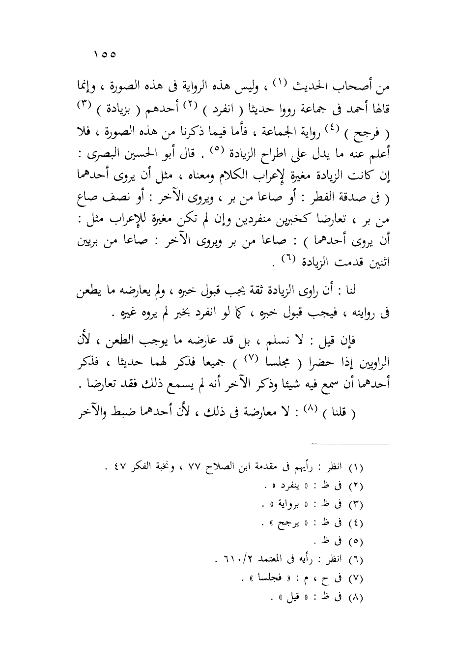من أصحاب الحديث، وليس هذه الرواية في هذه الصورة، وإنما قالها أحمد في جماعة رووا حديثاً (انفرد) أحدهم (بزيادة) (فرجح) رواية الجماعة، فأما فيما ذكرنا من هذه الصورة، فلا أعلم عنه ما يدل على اطراح الزيادة. قال أبو الحسين البصري: إن كانت الزيادة مغيرة لإعراب الكلام ومعناه، مثل أن يروي أحدهما (في صدقة الفطر: أو صاعا من بر، ويروى الآخر: أو نصف صاع من بر، تعارضاً كخبرين منفردين وإن لم تكن مغيرة للإعراب مثل: أن يروي أحدهما): صاعاً من بر ويروي الآخر: صاعاً من بريين اثنين قدمت الزيادة.