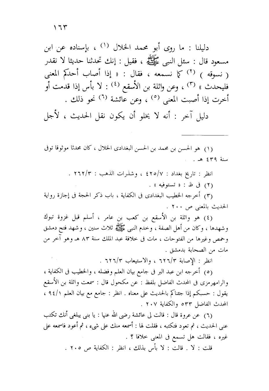 دليلنا: ما روى أبو محمد الخلال، بإسناده عن ابن مسعوتد قال: سئل النبي صلى الله عليه وسلم فقيل: إنك تحدثنا حديثاً لا نقدر (نسوقه) كما نسمعه، فقال: "إذا أصاب أحدكم المعنى فليحدث"، وعن واثلة بن الأسقع: لا بأس إذا قدمت أو أخرت إذا أصبت المعنى، وعن عائشة نحو ذلك.