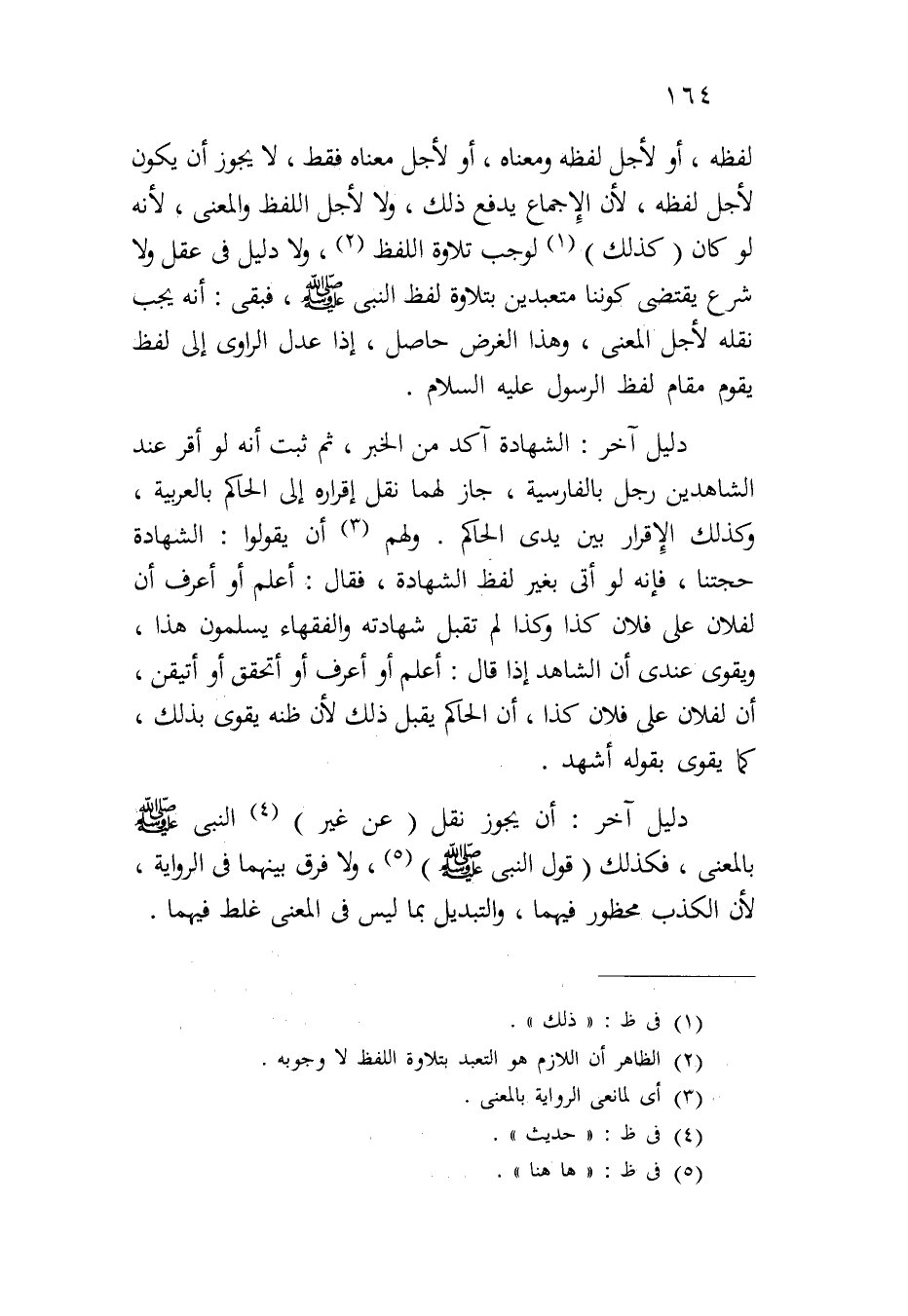 لفظه، أو لأجل لفظه ومعناه، أو لأجل معناه فقط، لا يجوز أن يكون لأجل لفظه، لأن الإجماع يدفع ذلك، ولا لأجل اللفظ والمعنى، لأنه لو كان (كذلك) لوجب تلاوة اللفظ، ولا دليل في عقل ولا شرع يقتضي كوننا متعبدين بتلاوة لفظ النبي صلى الله عليه وسلم، فبقي: أنه يجب نقله لأجل المعنى، وهذا الغرض حاصل، إذا عدل الراوي إلى لفظ يقوم مقام لفظ الرسول عليه السلام.