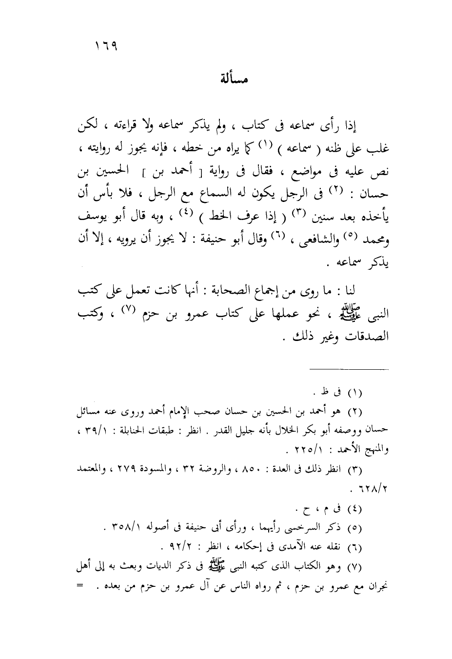 إذا رأى سماعه في كتاب، ولم يذكر سماعه ولا قراءته، لكن غلب على ظنه (سماعه) كما يراه من خطه، فإنه يجوز له روايته، نص عليه في مواضع، فقال في رواية [أحمد بن) الحسين بن حسان: في الرجل يكون له السماع مع الرجل، فلا بأس أن يأخذه بعد سنين (إذا عرف الخط) وبه قال أبو يوسف ومحمد والشافعي، وقال أبو حنيفة: لا يجوز أن يرويه، إلا أن يذكر سماعه.