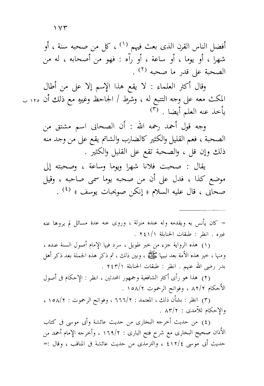 أفضل الناس القرن الذي بعث فيهم، كل من صحبه سنة، أو شهراً، أو يوماً، أو ساعة، أو رآه: فهو من أصحابه، له من الصحبة على قدر ما صحبه.