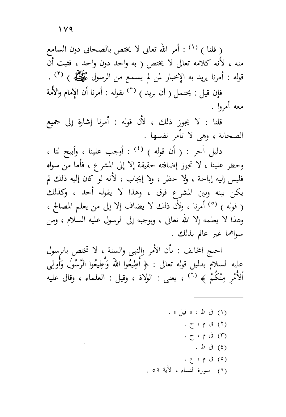 دليل آخر: (أن قوله): أوجب علينا، وأبيح لنا، وحظر علينا، لا تجوز إضافته حقيقة إلا إلى المشرع، فأما من سواه فليس إليه إباحة، ولا حظر، ولا إيجاب، لأنه لو كان إليه ذلك لم يكن بينه وبين المشرع فرق، وهذا لا يقوله أحد، وكذلك (قوله) أمرنا، ولأن ذلك لا يضاف إلا إلى من يعلم المصالح، وهذا لا يعلمه إلا الله تعالى، ويوجبه إلى الرسول عليه السلام، ومن سواهما غير عالم بذلك.