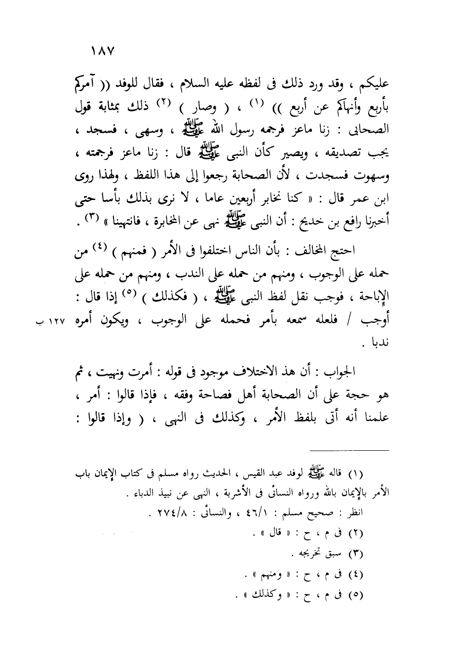 الجواب: أن هذا الاختلاف موجود في قوله: أمرت ونهيت، ثم هو حجة على أن الصحابة أهل فصاحة وفقه، فإذا قالوا: أمر، علمنا أنه أتى بلفظ الأمر، وكذلك في النهي، (وإذا قالوا: