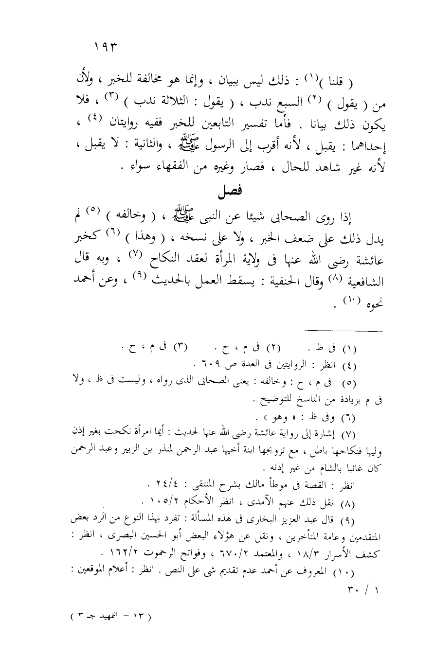 (قلنا): ذلك ليس ببيان، وإنما هو مخالفة للخبر، ولأن من (يقول) السبع ندب، (يقول: الثلاثة ندب)، فلا يكون ذلك بياناً. فأما تفسير التابعين للخبر ففيه روايتان، إحداهما: يقبل، لأنه أقرب إلى الرسول صلى الله عليه وسلم، والثانية: لا يقبل، لأنه غير شاهد للحال، فصار وغيره من الفقهاء سواء.