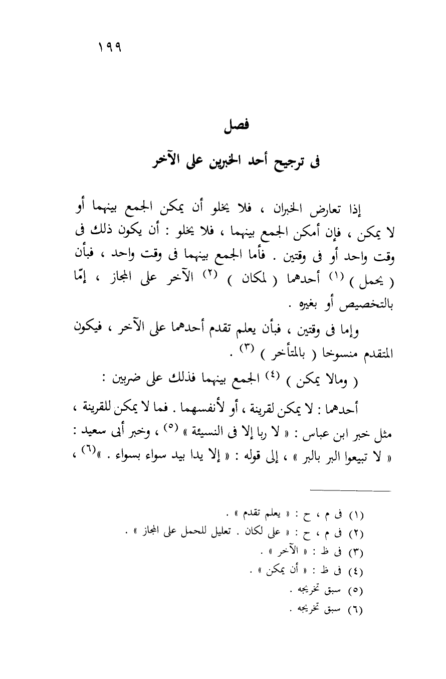 أحدهما: لا يمكن لقرينة، أو لأنفسهما. فما لا يمكن للقرينة، مثل خبر ابن عباس: "لا ربا إلا في النسيئة"، وخبر أبي سعيد: "لا تبيعوا البر بالبر"، إلى قوله: "إلا يدا بيد سواء بسواء".