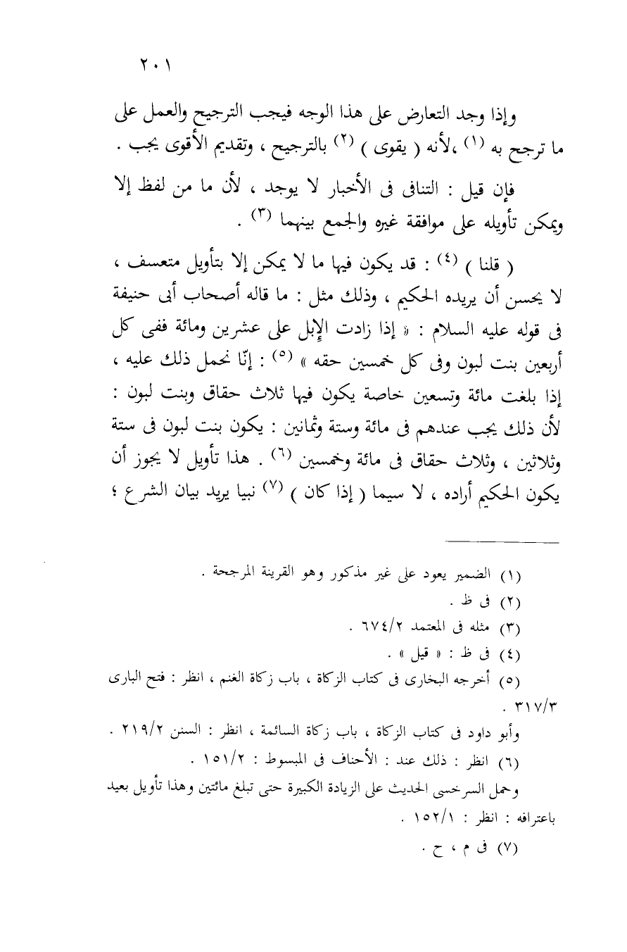 (قلنا): قد يكون فيها ما لا يمكن إلا بتأويل متعسف، لا يحسن أن يريده الحكيم، وذلك مثل: ما قاله أصحاب أبي حنيفة في قوله عليه السلام: "إذا زادت الإبل على عشرين ومائة ففي كل أربعين بنت لبون وفي كل خمسين حقه": إنا نحمل ذلك عليه، إذا بلغت مائعة وتسعين خاصة يكون فيها ثلاث حقاق وبنت لبون: لأن ذلك يجب عندهم في مائعة وستة وثمانين: يكون بنت لبون في ستة وثلاثين، وثلاث حقاق في مائعة وخمسين. هذا تأويل لا يجوز أن يكون الحكيم أراده، لا سيما (إذا كان) نبياً يريد بيان الشرع؛