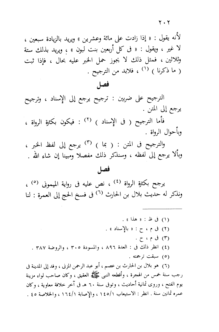 يرجح بكثرة الرواة، نص عليه في رواية الميموني، ونذكر له حديث بلال بن الحارث في فسخ الحج إلى العمرة: لنا