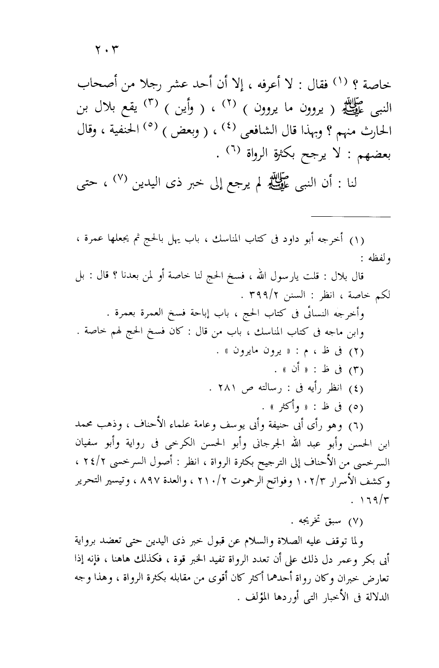 خاصة؟ فقال: لا أعرفه، إلا أن أحد عشر رجلاً من أصحاب النبي صلى الله عليه وسلم (يروون ما يروون)، (وأين) يقع بلال بن الحارث منهم؟ وبهذا قال الشافعي، (وبعض) الحنفية، وقال بعضهم: لا يرجح بكثرة الرواة.
