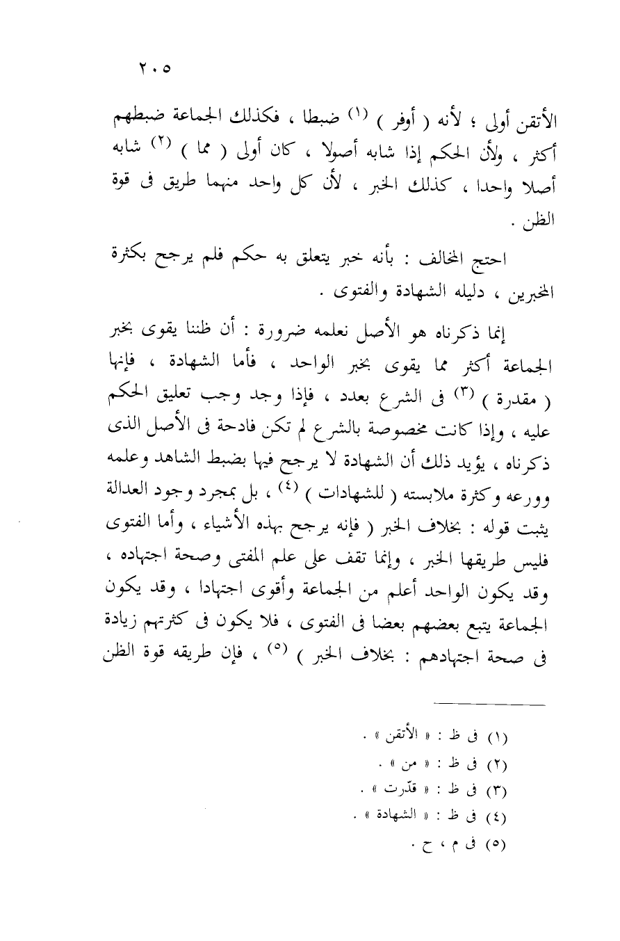 إنما ذكرناه هو الأصل نعلمه ضرورة: أن ظننا يقوى بخبر الجماعة أكثر مما يقوى بخبر الواحد، فأما الشهادة، فإنها (مقدرة) في الشرع بعدد، فإذا وجد وجب تعليق الحكم عليه، وإذا كانت مخصوصة بالشرع لم تكن فادحة في الأصل الذي ذكرناه، يؤيد ذلك أن الشهادة لا يرجح فيها بضبط الشاهد وعلمه وورعه وكثرة ملابسته (للشهادات) بل بمجرد وجود العدالة يثبت قوله: بخلاف الخبر (فإنه يرجح بهذه الأشياء، وأما الفتوى فليس طريقها الخبر، وإنما تقف على علم المفتي وصحة اجتهاده، وقد يكون الواحد أعلم من الجماعة وأقوى اجتهاداً، وقد يكون الجماعة يتبع بعضهم بعضاً في الفتوى، فلا يكون في كثرتهم زيادة في صحة اجتهادهم: بخلاف الخبر)، فإن طريقه قوة الظن