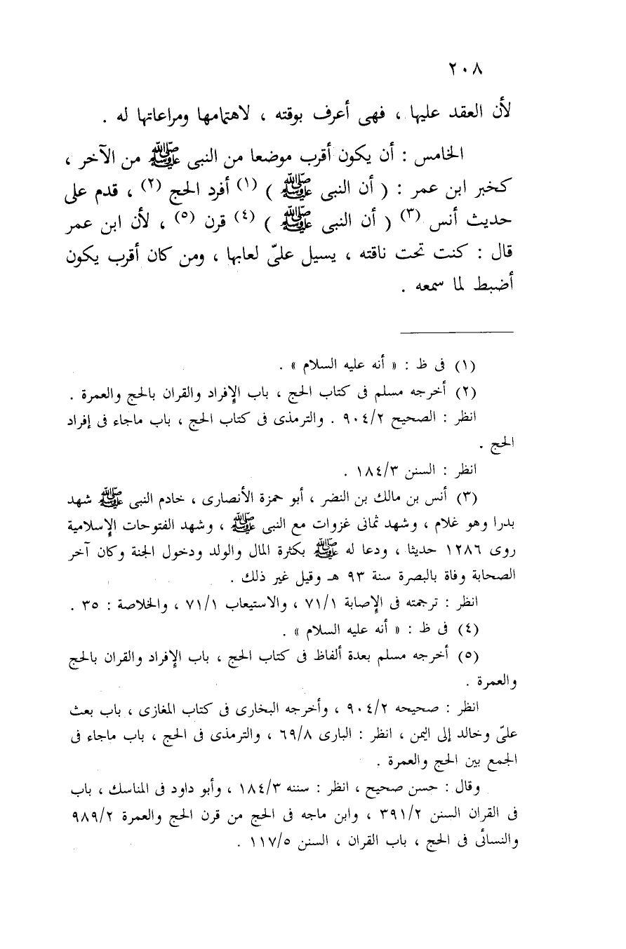 الخامس: أن يكون أقرب موضعاً من النبي صلى الله عليه وسلم من الآخر، كخبر ابن عمر: (أن النبي صلى الله عليه وسلم) أفرد الحج، قدم على حديث أنس (أن النبي صلى الله عليه وسلم) قرن، لأن ابن عمر قال: كنت تحت ناقته، يسيل علي لعابها، ومن كان أقرب يكون أضبط لما سمعه.