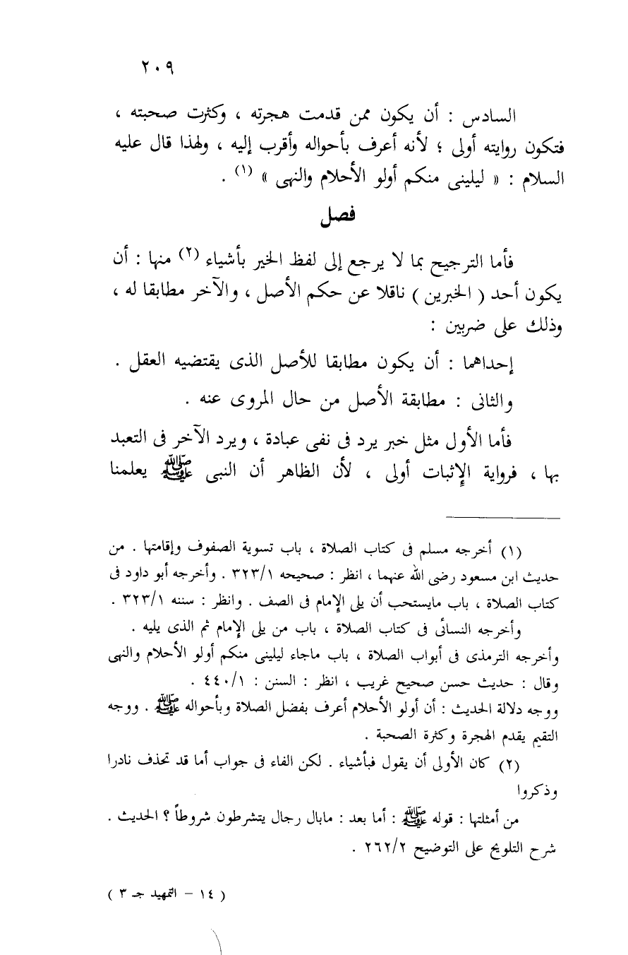 السادس: أن يكون ممن قدمت هجرته، وكثرت صحبته، فتكون روايته أولى؛ لأنه أعرف بأحواله وأقرب إليه، ولهذا قال عليه السلام: "ليليني منكم أولو الأحلام والنهي".
