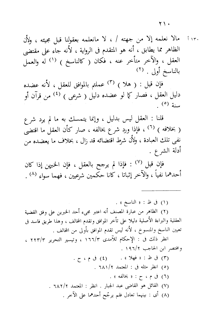 مالا نعلمه إلا من جهته/، لا ما نعلمه بعقولنا قبل مجيئه، ولأن الظاهر مما يطابق، أنه هو المتقدم في الرواية، لأنه جاء على مقتضى العقل، والآخر متأخر عنه، فكان (كالناسخ) له والعمل بالناسخ أولى.
