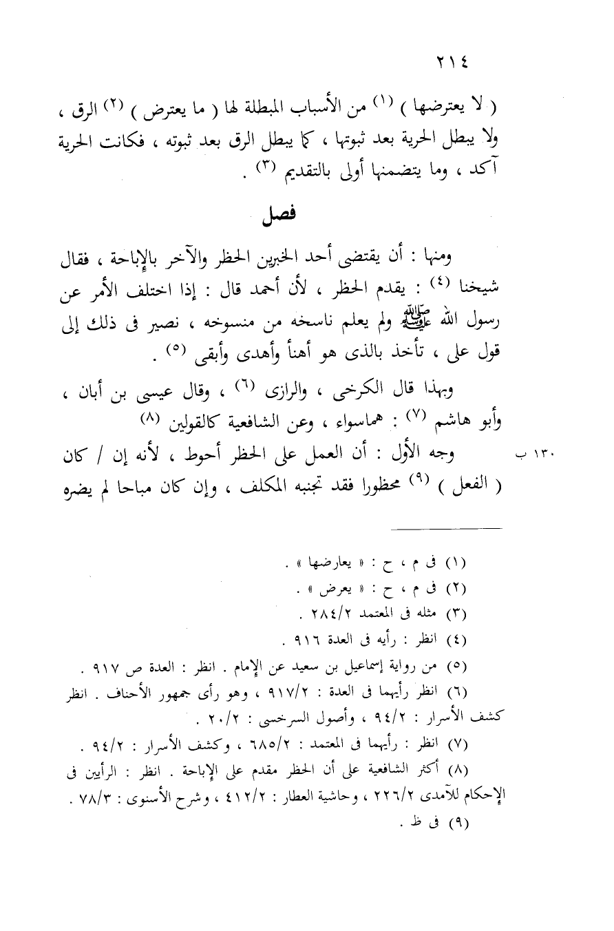 وجه الأول: أن العمل على الحظر أحوط، لأنه إن/ كان (الفعل) محظوراً فقد تجنبه المكلف، وإن كان مباحاً لم يضره