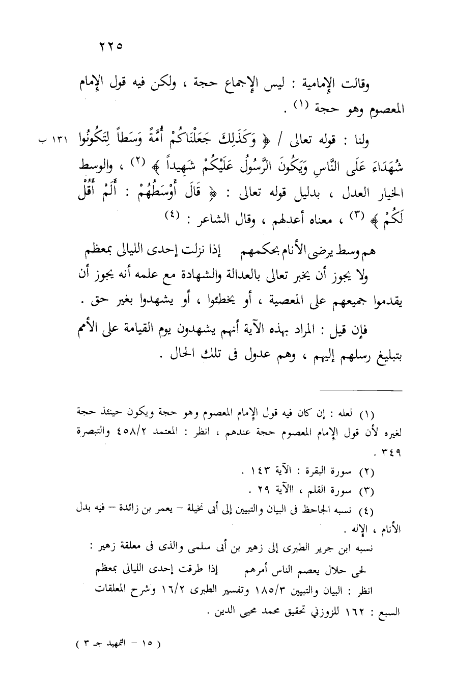 ولا يجوز أن يخبر تعالى بالعدالة والشهادة مع علمه أنه يجوز أن يقدموا جميعهم على المعصية، أو يخطئوا، أو يشهدوا بغير حق.