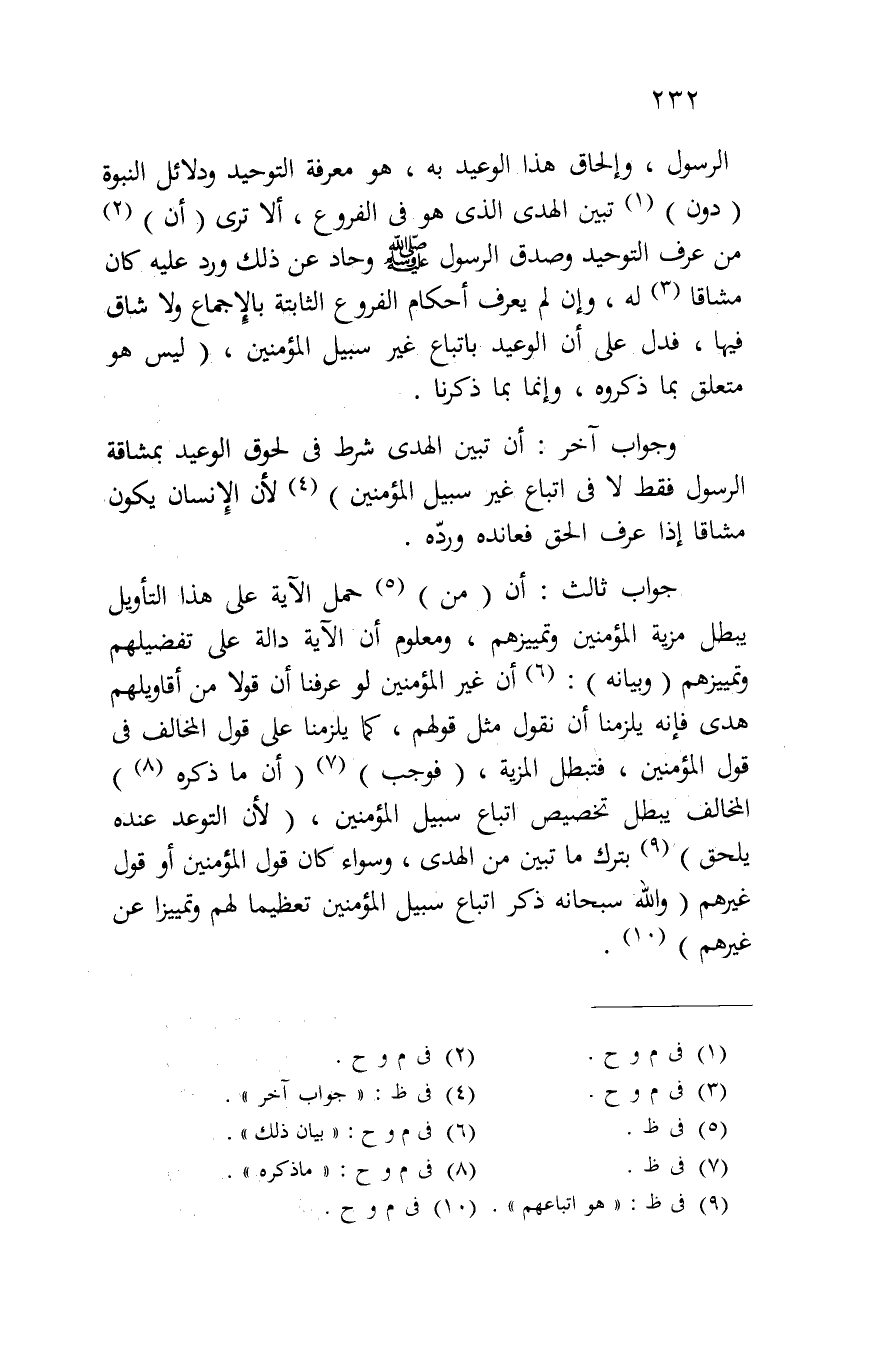 جواب ثالث: أن (من) حمل الآية على هذا التأويل يبطل مزية المؤمنين وتمييزهم، ومعلوم أن الآية دالة على تفضيلهم وتمييزهم (وبيانه): أن غير المؤمنين لو عرفنا أن قولاً من أقاويلهم هدى فإنه يلزمنا أن نقول مثل قولهم، كما يلزمنا على قول المخالف في قول المؤمنين، فتبطل المزية، (فوجب) (أن ما ذكره) المخالف يبطل تخصيص اتباع سبيل المؤمنين، (لأن التوعد عنده يلحق) بترك ما تبين من الهدى، وسواء كان قول المؤمنين أو قول غيرهم (والله سبحانه ذكر اتباع سبيل المؤمنين تعظيماً لهم وتمييزاً عن غيرهم).