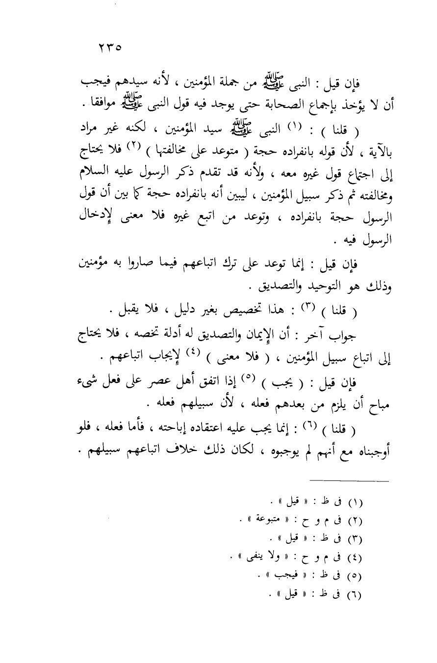 (قلنا): النبي صلى الله عليه وسلم سيد المؤمنين، لكنه غير مراد بالآية، لأن قوله بانفراده حجة (متوعد على مخالفتها) فلا يحتاج إلى اجتماع قول غيره معه، ولأنه قد تقدم ذكر الرسول عليه السلام ومخالفته ثم ذكر سبيل المؤمنين، ليبين أنه بانفراده حجة كما بين أن قول الرسول حجة بانفراده، وتوعد من اتبع غيره فلا معنى لإدخال الرسول فيه.
