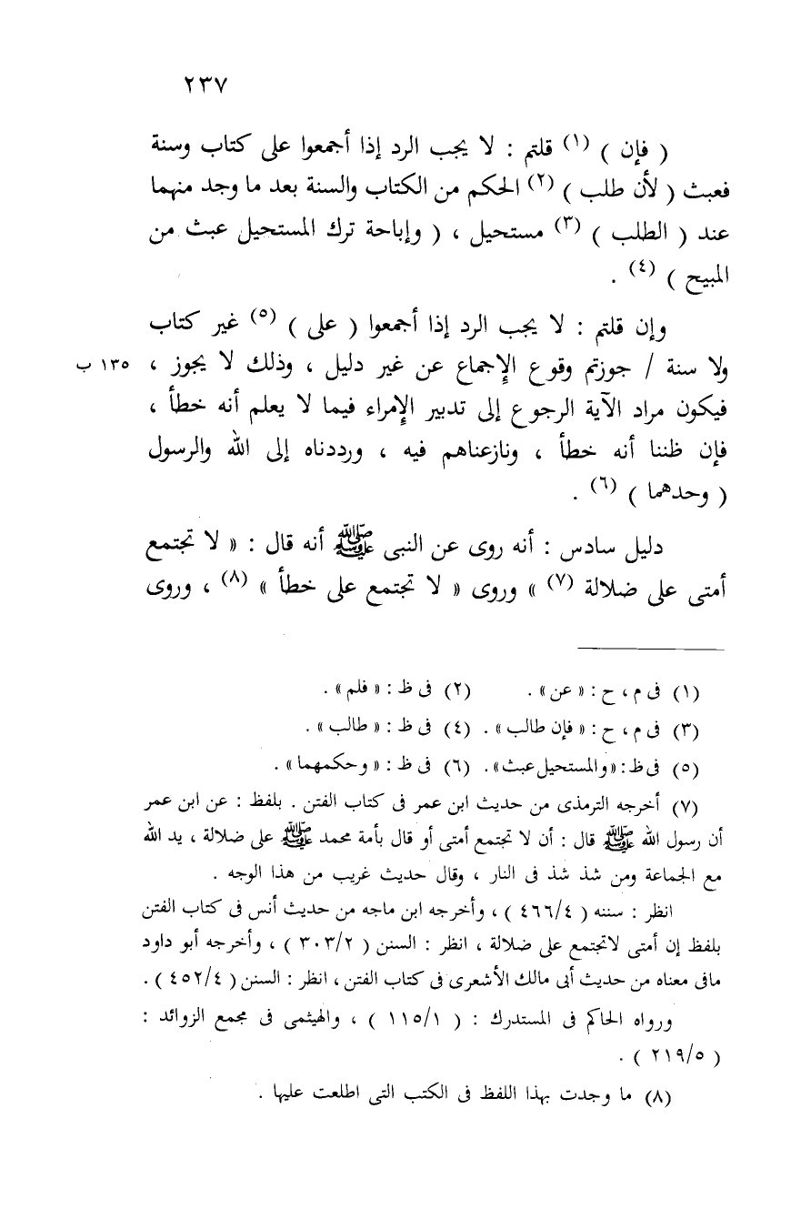 (فإن) قلتم: لا يجب الرد إذا أجمعوا على كتاب وسنة فعبث (لأن طلب) الحكم من الكتاب والسنة بعد ما وجد منهما عند (الطلب) مستحيل، (وإباحة ترك المستحيل عبث من المبيح).