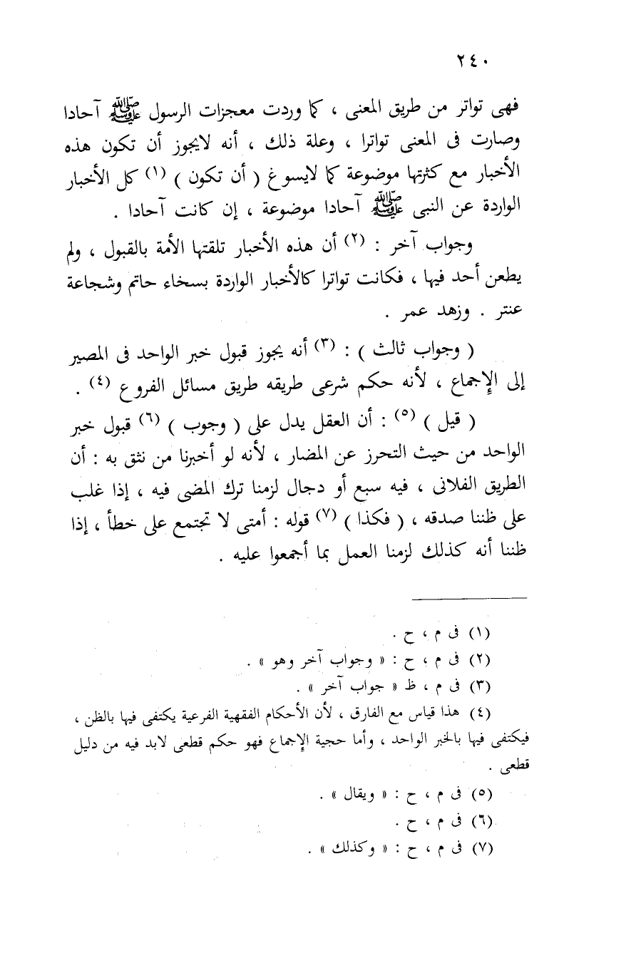 وجواب آخر: أن هذه الأخبار تلقتها الأمة بالقبول، ولم يطعن أحد فيها، فكانت تواتراً كالأخبار الواردة بسخاء حاتم وشجاعة عنتر. وزهد عمر.