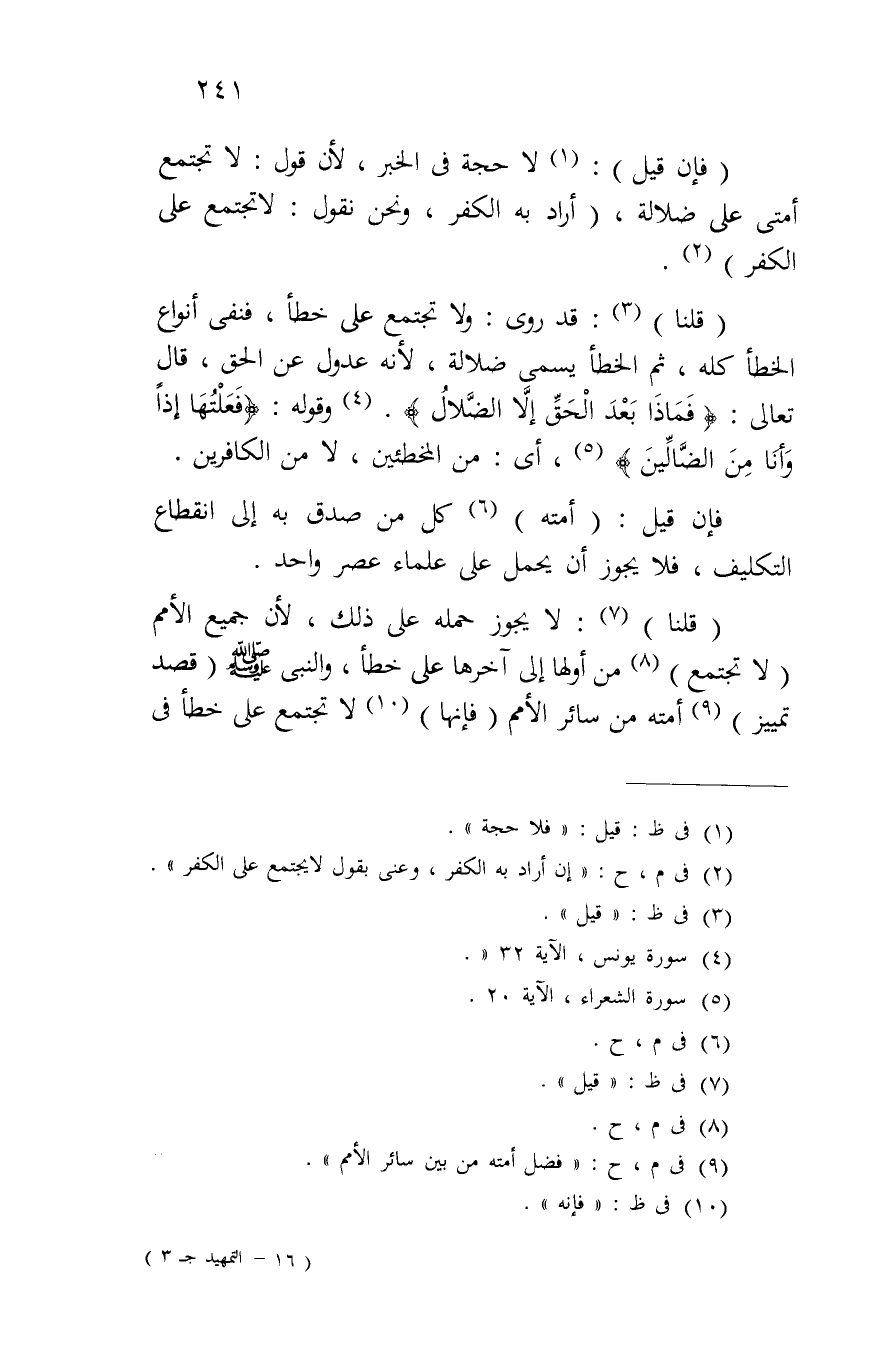 (قلنا): قد روى: ولا تجتمع على خطأ، فنفى أنواع الخطأ كله، ثم الخطأ يسمى ضلالة، لأنه عدول عن الحق، قال تعالى: {فَمَاذَا بَعْدَ الْحَقِّ إِلَاّ الضَّلالُ} وقوله: {فَعَلْتُهَا إِذاً وَأَنَا مِنْ الضَّالِّينَ} أي: من المخطئين، لا من الكافرين.