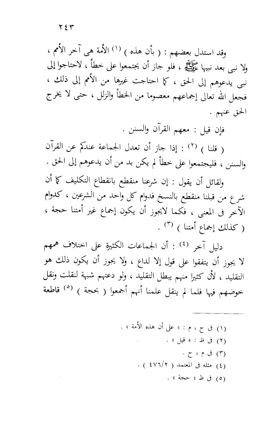 وقد استدل بعضهم: (بأن هذه) الأمة هي آخر الأمم، ولا نبي بعد نبيها صلى الله عليه وسلم، فلو جاز أن يجتمعوا على خطأ، لاحتاجوا إلى نبي يدعوهم إلى الحق، كما احتاجت غيرها من الأمم إلى ذلك، فجعل الله تعالى إجماعهم معصوماً من الخطأ والزلل، حتى لا يخرج الحق عنهم.