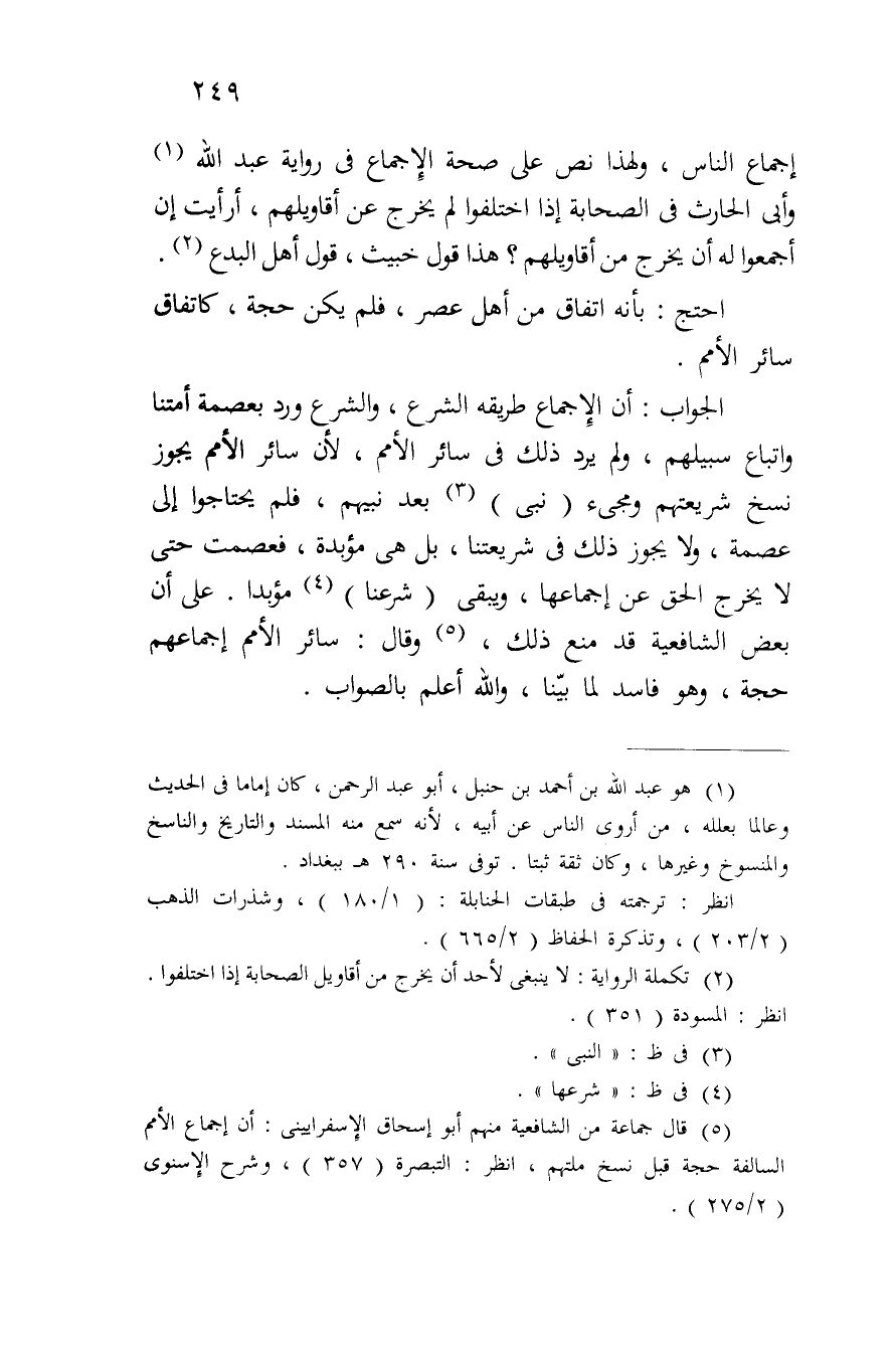 إجماع الناس، ولهذا نص على صحة الإجماع في رواية عبد الله وأبي الحارث في الصحابة إذا اختلفوا لم يخرج عن أقاويلهم، أرأيت إن أجمعوا له أن يخرج من أقاويلهم؟ هذا قول خبيث، قول أهل البدع.