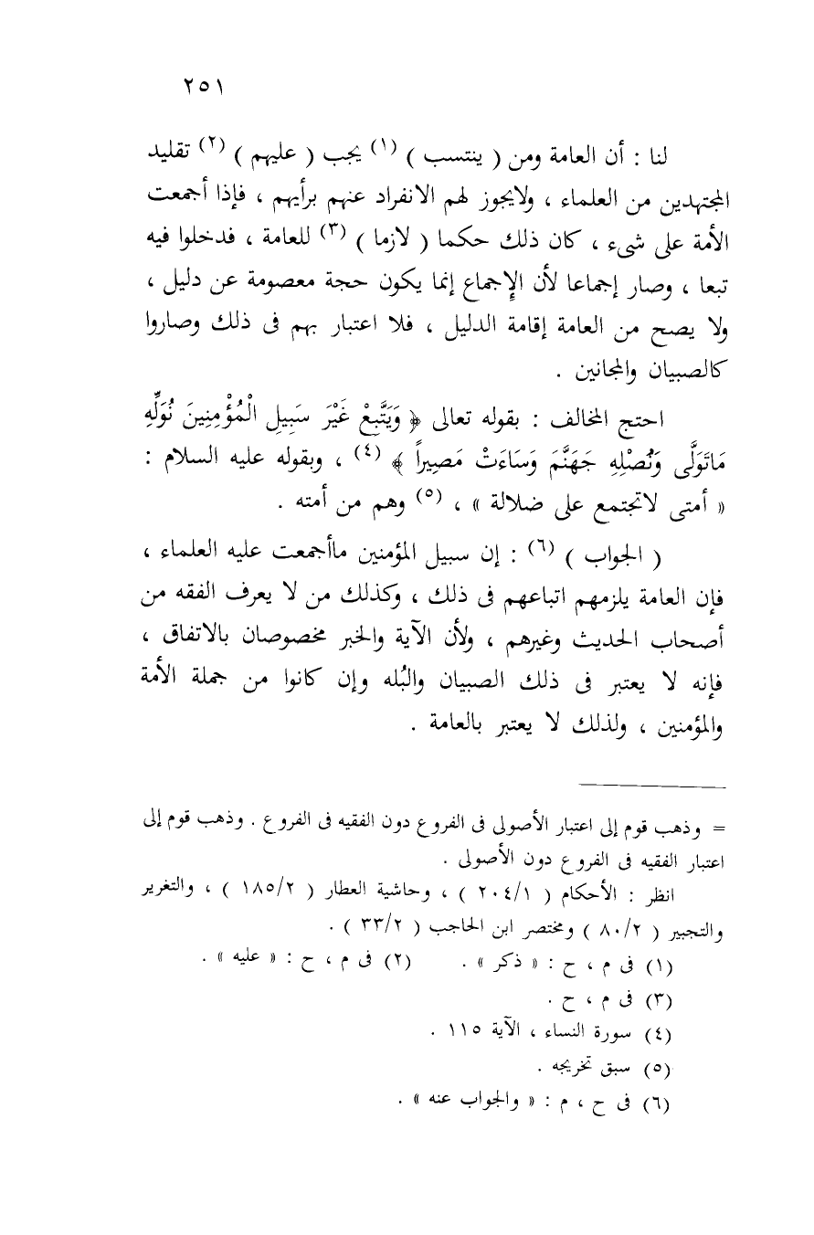 (الجواب): إن سبيل المؤمنين ما أجمعت عليه العلماء، فإن العامة يلزمهم اتباعهم في ذلك، وكذلك من لا يعرف الفقه من أصحاب الحديث وغيرهم، ولأن الآية والخبر مخصوصان بالاتفاق، فإنه لا يعتبر في ذلك الصبيان والبله وإن كانوا من جملة الأمة والمؤمنين، ولذلك لا يعتبر بالعامة.