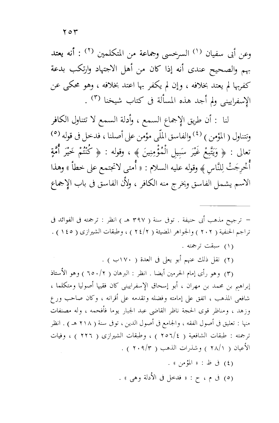 وعن أبي سفيان السرخسي وجماعة من المتكلمين: أنه يعتد بهم والصحيح عندي أنه إذا كان من أهل الاجتهاد وارتكب بدعة كفر بها لم يعتد بخلافه، وإن لم يكفر بها اعتد بخلافه، وهو محكي عن الإسفراييني ولم أجد هذه المسألة في كتاب شيخنا.