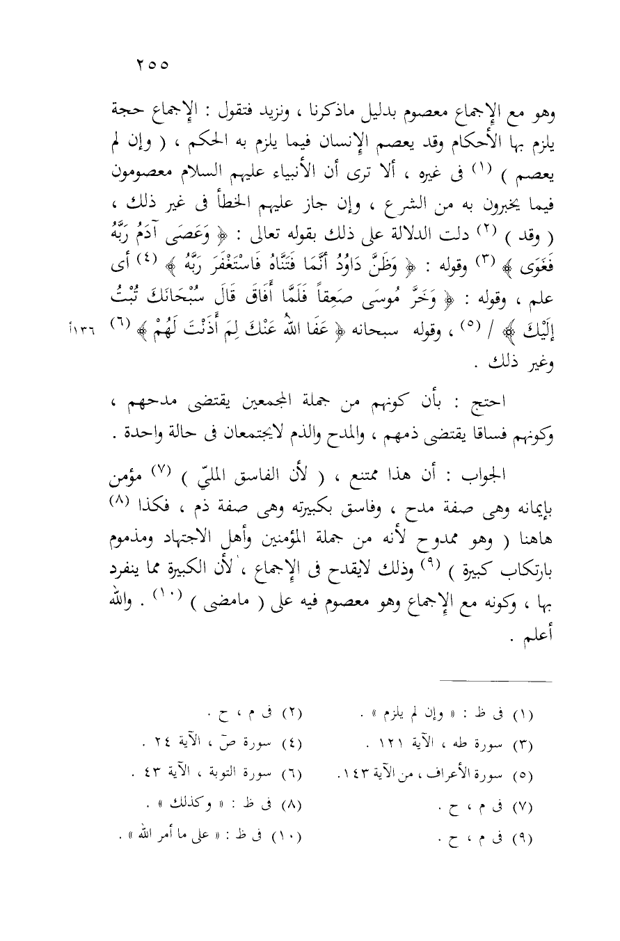 وهو مع الإجماع معصوم بدليل ما ذكرنا، ونزيد فتقول: الإجماع حجة يلزم بها الأحكام وقد يعصم الإنسان فيما يلزم به الحكم، (وإن لم يعصم) في غيره، ألا ترى أن الأنبياء عليهم السلام معصومون فيما يخبرون به من الشرع، وإن جاز عليهم الخطأ في غير ذلك، (وقد) دلت الدلالة على ذلك بقوله تعالى: {وَعَصَى آدَمُ رَبَّهُ فَغَوَى} وقوله: {وَظَنَّ دَاوُودُ أَنَّمَا فَتَنَّاهُ فَاسْتَغْفَرَ رَبَّهُ} أي علم، وقوله: {وَخَرَّ مُوسَى صَعِقاً فَلَمَّا أَفَاقَ قَالَ سُبْحَانَكَ تُبْتُ إِلَيْكَ} وقوله سبحانه {عَفَا اللَّهُ عَنْكَ لِمَ أَذِنتَ لَهُمْ} وغير ذلك.