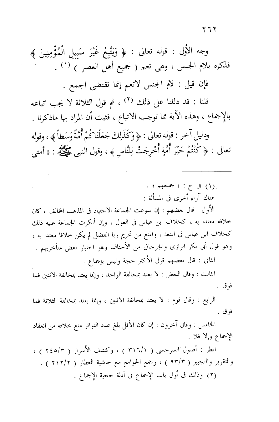 وجه الأول: قوله تعالى: {وَيَتَّبِعْ غَيْرَ سَبِيلِ الْمُؤْمِنِينَ} فذكره بلام الجنس، وهي تعم (جميع أهل العصر).