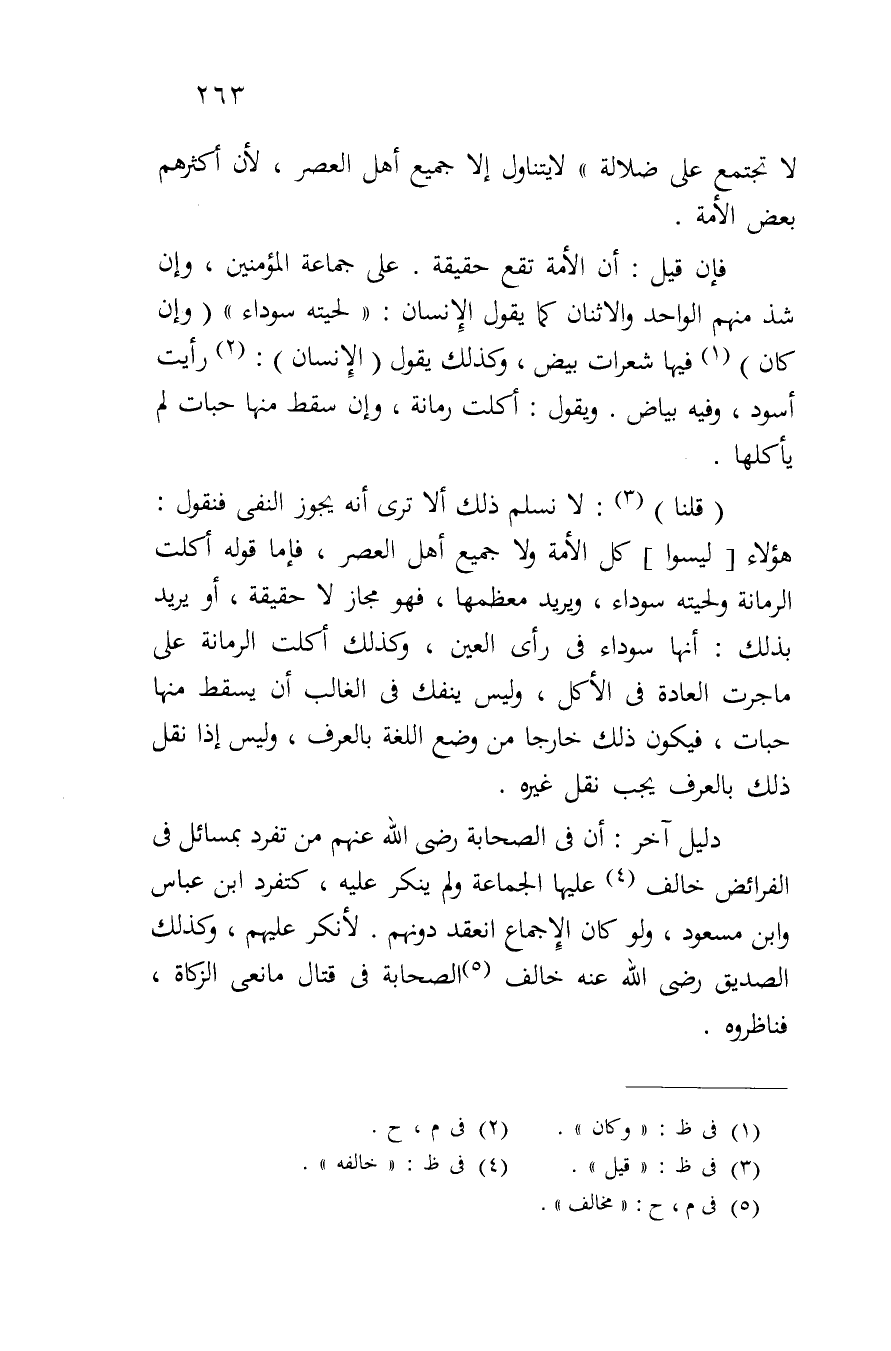 فإن قيل: أن الأمة تقع حقيقة. على جماعة المؤمنين، وإن شذ منهم الواحد والاثنان كما يقول الإنسان: "لحيته سوداء" (وإن كان) فيها شعرات بيض، وكذلك يقول (الإنسان): رأيت أسود، وفيه بياض. ويقول: أكلت رمانة، وإن سقط منها حبات لم يأكلها.