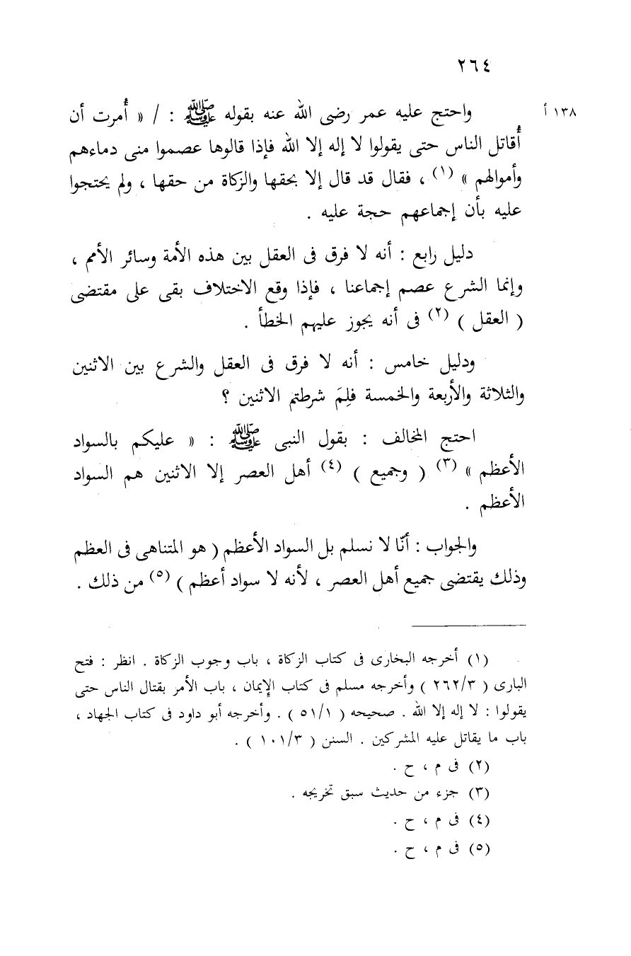واحتج عليه عمر رضي الله عنه بقوله صلى الله عليه وسلم:/ "أمرت أن أقاتل الناس حتى يقولوا لا إله إلا الله فإذا قالوها عصموا مني دماءهم وأموالهم"، فقال قد قال إلا بحقها والزكاة من حقها، ولم يحتجوا عليه بأن إجماعهم حجة عليه.