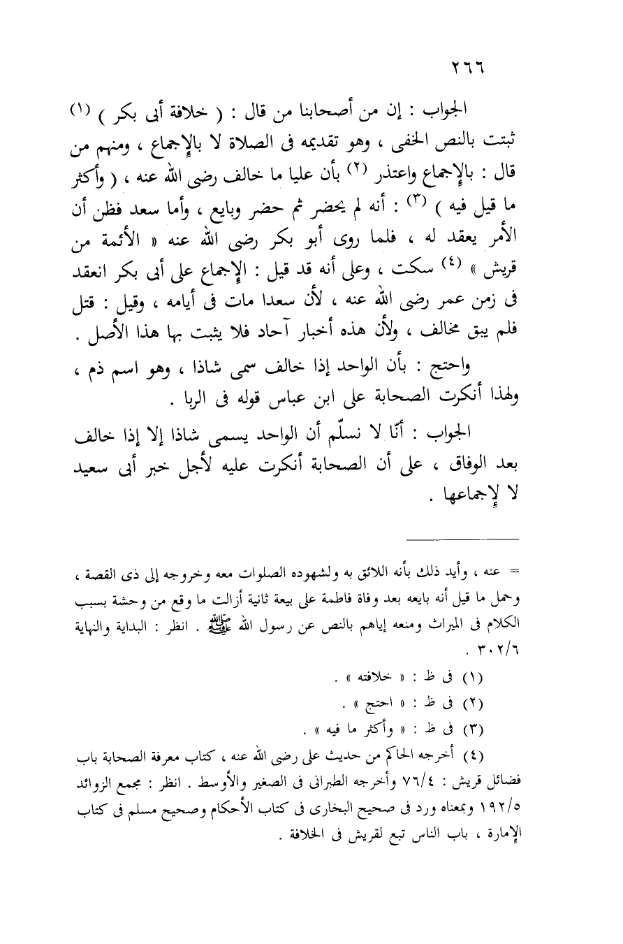 الجواب: إن من أصحابنا من قال: (خلافة أبي بكر) ثبتت بالنص الخفي، وهو تقديمه في الصلاة لا بالإجماع، ومنهم من قال: بالإجماع واعتذر بأن علياً ما خالف رضي الله عنه، (وأكثر ما قيل فيه): أنه لم يحضر ثم حضر وبايع، وأما سعد فظن أن الأمر يعقد له، فلما روى أبو بكر رضي الله عنه "الأئمة من قريش" سكت، وعلى أنه قد قيل: الإجماع على أبي بكر انعقد في زمن عمر رضي الله عنه، لأن سعداً مات في أيامه، وقيل: قتل فلم يبق مخالف، ولأن هذه أخبار آحاد فلا يثبت بها هذا الأصل.