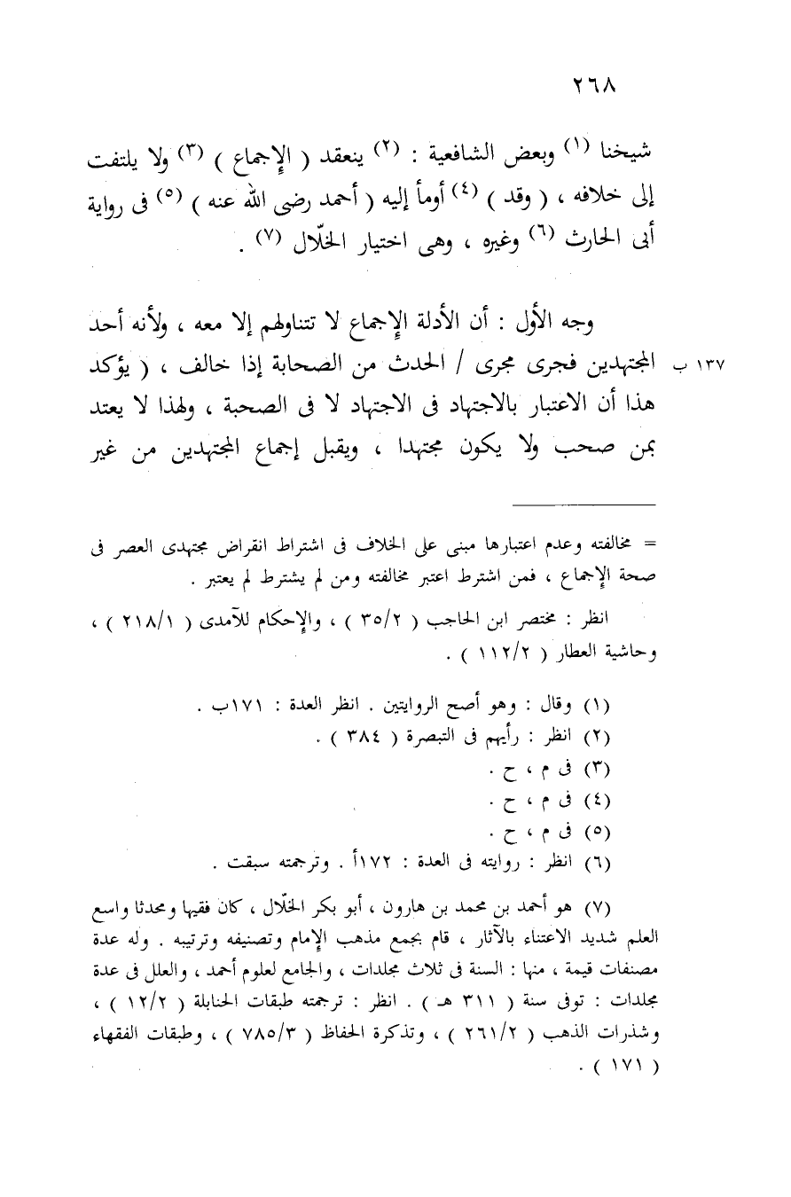 وجه الأول: أن الأدلة الإجماع لا تتناولهم إلا معه، ولأنه أحد المجتهدين فجرى مجرى/ الحدث من الصحابة إذا خالف، (يؤكد هذا أن الاعتبار بالاجتهاد في الاجتهاد لا في الصحبة، ولهذا لا يعتد بمن صحب ولا يكون مجتهداً، ويقبل إجماع المجتهدين من غير
