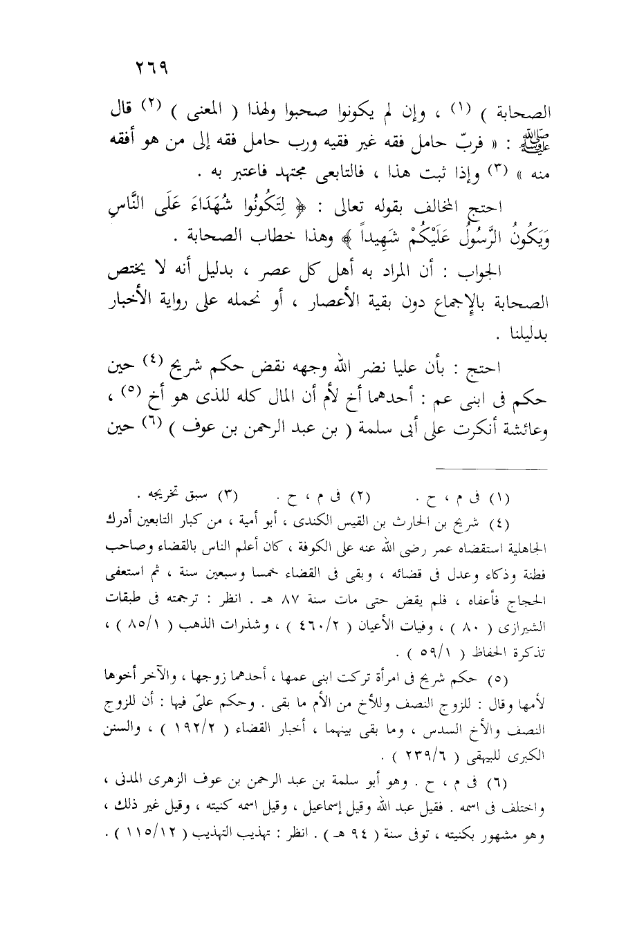 احتج: بأن علياً نصر الله وجهه نقض حكم شريح حين حكم في ابني عم: أحدهما أخ لأم أن المال كله للذي هو أخ، وعائشة أنكرت على أبي سلمة (بن عبد الرحمن بن عوف) حين