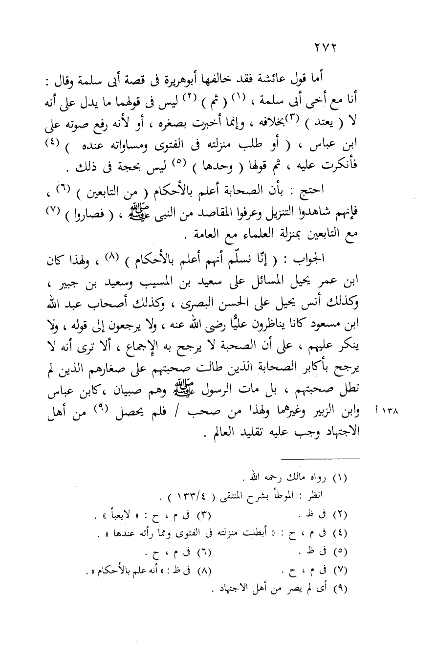 الجواب: (إنا نسلم أنهم أعلم بالأحكام)، ولهذا كان ابن عمر يحيل المسائل على سعيد بن المسيب وسعيد بن جبير، وكذلك أنس يحيل على الحسن البصري، وكذلك أصحاب عبد الله ابن مسعود كانا يناظرون علياً رضي الله عنه، ولا يرجعون إلى قوله، ولا ينكر عليهم، على أن الصحبة لا يرجح به الإجماع، ألا ترى أنه لا يرجح بأكابر الصحابة الذين طالت صحبتهم على صغارهم الذين لم تطل صحبتهم، بل مات الرسول صلى الله عليه وسلم وهم صبيان، كابن عباس وابن الزبير وغيرهما ولهذا من صحب/ فلم يحصل من أهل الاجتهاد وجب عليه تقليد العالم.