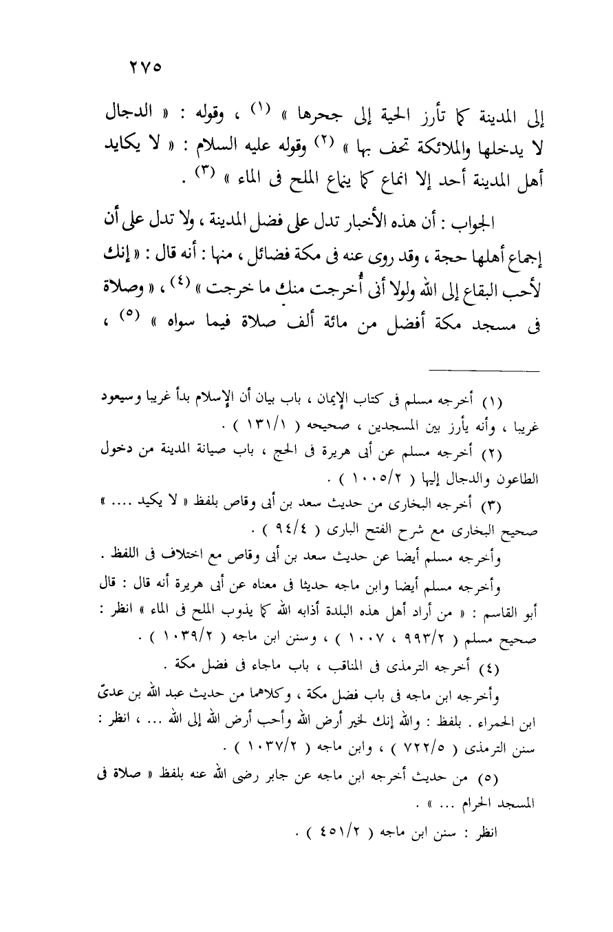 الجواب: أن هذه الأخبار تدل على فضل المدينة، ولا تدل على أن إجماع أهلها حجة، وقد روى عنه في مكة فضائل، منها: أنه قال: "إنك لأحب البقاع إلى الله ولولا أني أخرجت منك ما خرجت"، "وصلاة في مسجد مكة أفضل من مائة ألف صلاة فيما سواه"،