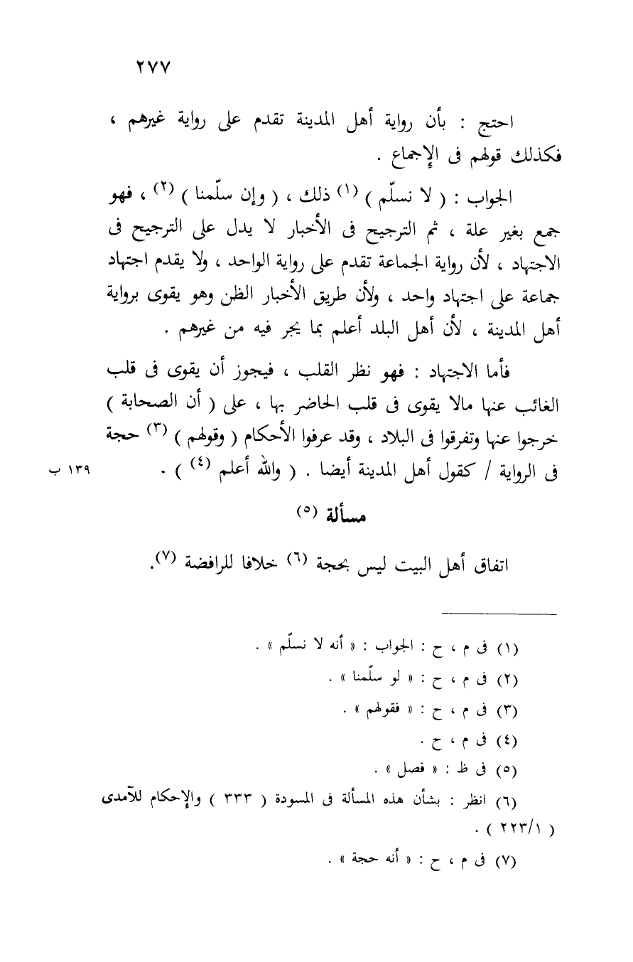 الجواب: (لا نسلم) ذلك، (وإن سلمنا) فهو جمع بغير علة، ثم الترجيح في الأخبار لا يدل على الترجيح في الاجتهاد، لأن رواية الجماعة تقدم على رواية الواحد، ولا يقدم اجتهاد جماعة على اجتهاد واحد، ولأن طريق الأخبار الظن وهو يقوى برواية أهل المدينة، لأن أهل البلد أعلم بما يجر فيه من غيرهم.