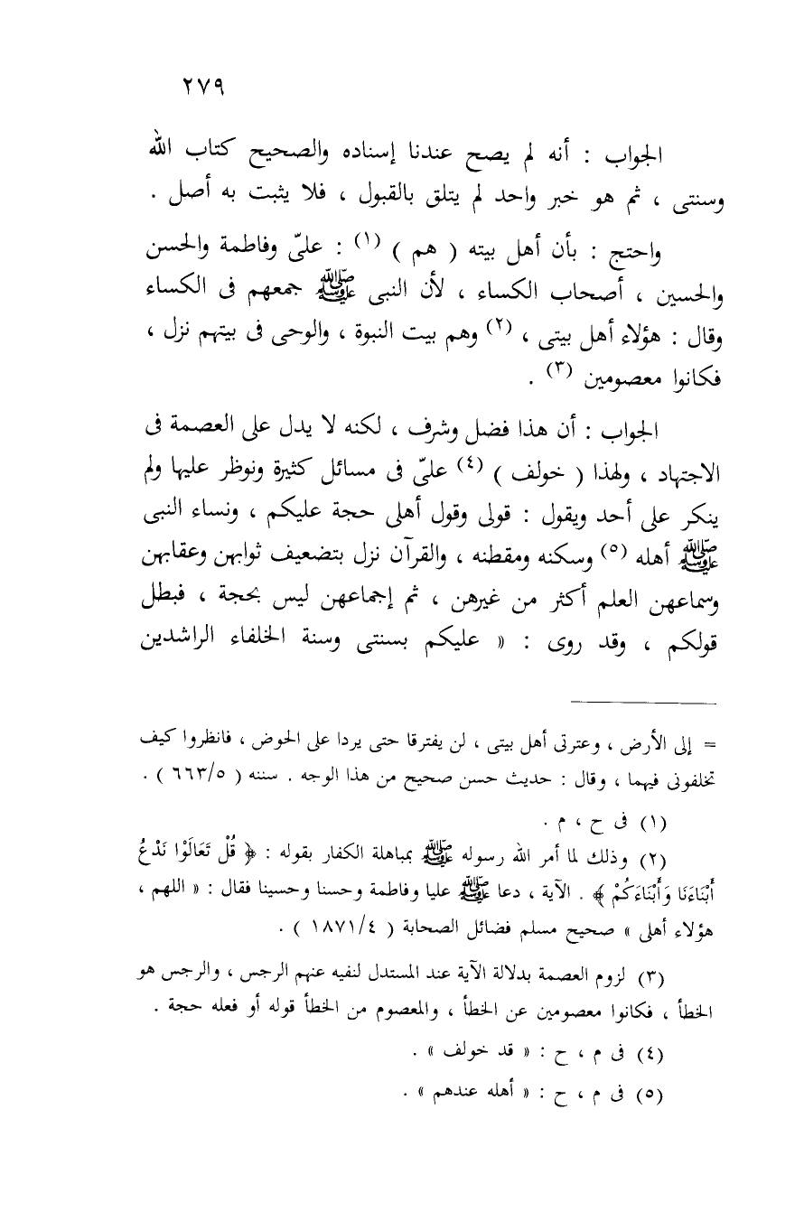 الجواب: أن هذا فضل وشرف، لكنه لا يدل على العصمة في الاجتهاد، ولهذا (خولف) علي في مسائل كثيرة ونوظر عليها ولم ينكر على أحد ويقول: قولي وقول أهلي حجة عليكم، ونساء النبي صلى الله عليه وسلم أهله وسكنه ومقطنه، والقرآن نزل بتضعيف ثوابهن وعقابهن وسماعهن العلم أكثر من غيرهن، ثم إجماعهن ليس بحجة، فبطل قولكم، وقد روى: "عليكم بسنتي وسنة الخلفاء الراشدين