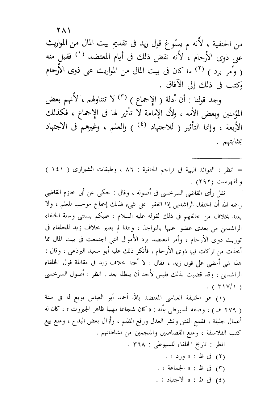 من الحنفية، لأنه لم يسوغ قول زيد في تقديم بيت المال من المواريث على ذوي الأرحام، لأنه نقض ذلك في أيام المعتضد فقبل منه (وأمر برد) ما كان في بيت المال من المواريث على ذوي الأرحام وكتب في ذلك إلى الآفاق.