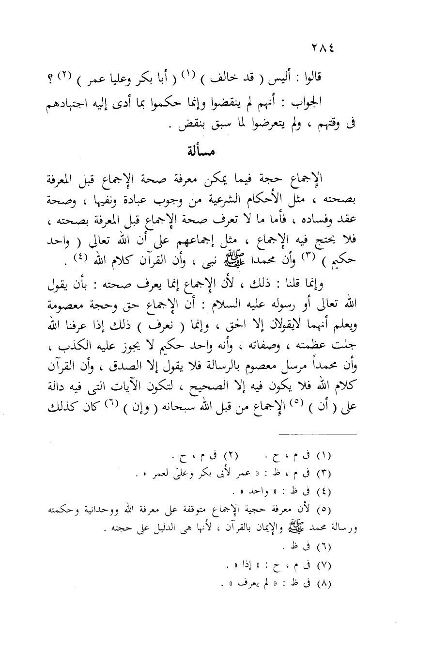 وإنما قلنا: ذلك، لأن الإجماع إنما يعرف صحته: بأن يقول الله تعالى أو رسوله عليه السلام: أن الإجماع حق وحجة معصومة ويعلم أنهما لا يقولان إلا الحق، وإنما (نعرف) ذلك إذا عرفنا الله جلت عظمته، وصفاته، وأنه واحد حكيم لا يجوز عليه الكذب، وأن محمداً مرسل معصوم بالرسالة فلا يقول إلا الصدق، وأن القرآن كلام الله فلا يكون فيه إلا الصحيح، لتكون الآيات التي فيه دالة على (أن) الإجماع من قبل الله سبحانه (وإن) كان كذلك
