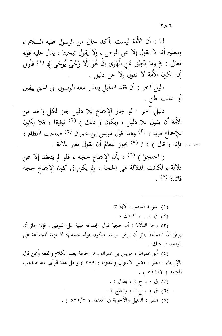 دليل آخر: لو جاز الإجماع بلا دليل جاز لكل واحد من الأمة أن يقول بلا دليل، ويكون (ذلك) توفيقاً، فلا يكون للإجماع مزية، وهذا قول مويس بن عمران صاحب النظام، فإنه (قال): يجوز للعالم أن يقول بغير دلالة.