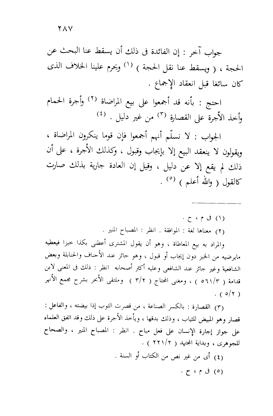الجواب: لا نسلم أنهم أجمعوا فإن قوماً ينكرون المراضاة، ويقولون لا ينعقد البيع إلا بإيجاب وقبول، وكذلك الأجرة، على أن ذلك لم يقع إلا عن دليل، وقيل إن الادة جارية بذلك صارت كالقول (والله أعلم).