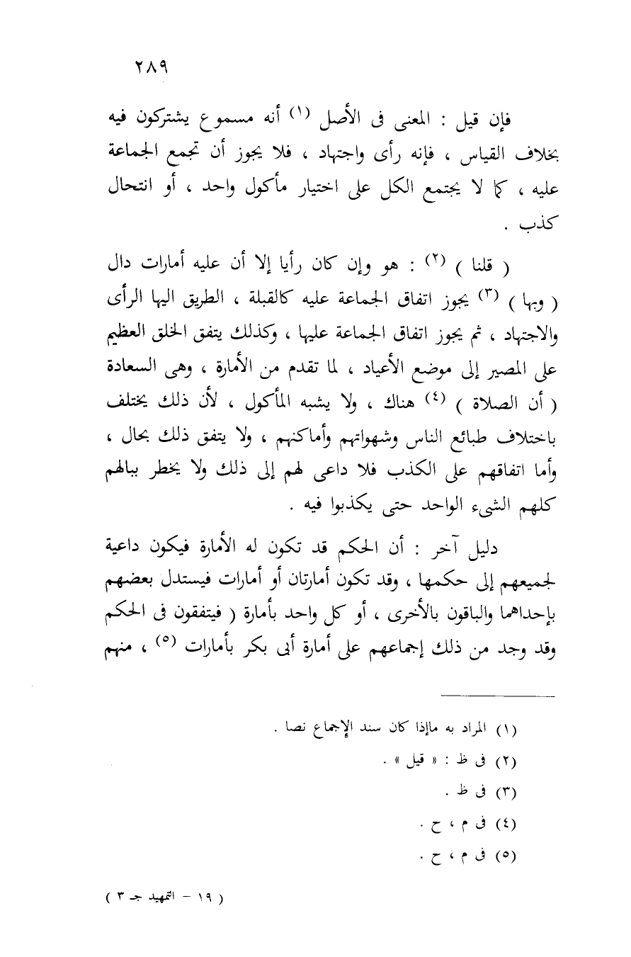دليل آخر: أن الحكم قد تكون له الأمارة فيكون داعية لجميعهم إلى حكمها، وقد تكون أمارتان أو أمارات فيستدل بعضهم بإحداهما والباقون بالأخرى، أو كل واحد بأمارة (فيتفقون في الحكم وقد وجد من ذلك إجماعهم على أمارة أبي بكر بأمارات، منهم