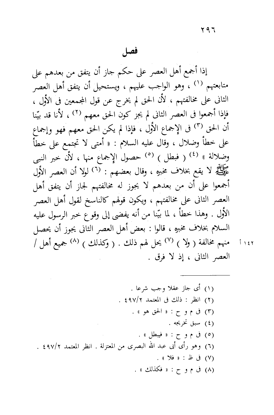 إذا أجمع أهل العصر على حكم جاز أن يتفق من بعدهم على متابعتهم، وهو الواجب عليهم، ويستحيل أن يتفق أهل العصر الثاني على مخالفتهم، لأن الحق لم يخرج عن قول المجمعين في الأول، فإذا أجمعوا في العصر الثاني لم يجز كون الحق معهم، لأنا قد بينا أن الحق في الإجماع الأول، فإذا لم يكن الحق معهم فهو وإجماع على خطأ وضلال، وقال عليه السلام: "أمتي لا تجتمع على خطأ وضلالة" (فبطل) حصول الإجماع منها، لأن خبر النبي صلى الله عليه وسلم لا يقع بخلاف مخبره، وقال بعضهم: لولا أن العصر الأول أجمعوا على أن من بعدهم لا يجوز له مخالفتهم لجاز أن يتفق أهل العصر الثاني على مخالفتهم، ويكون قولهم كالناسخ لقول أهل العصر الأول. وهذا خطأ، لما بينا من أنه يفضي إلى وقوع خبر الرسول عليه السلام بخلاف مخبره، قالوا: بعض أهل العصر الثاني يجوز أن يحصل منهم مخالفة (ولا) يحل هم ذلك. (وكذلك) جميع أهل العصر الثاني، إذ لا فرق.