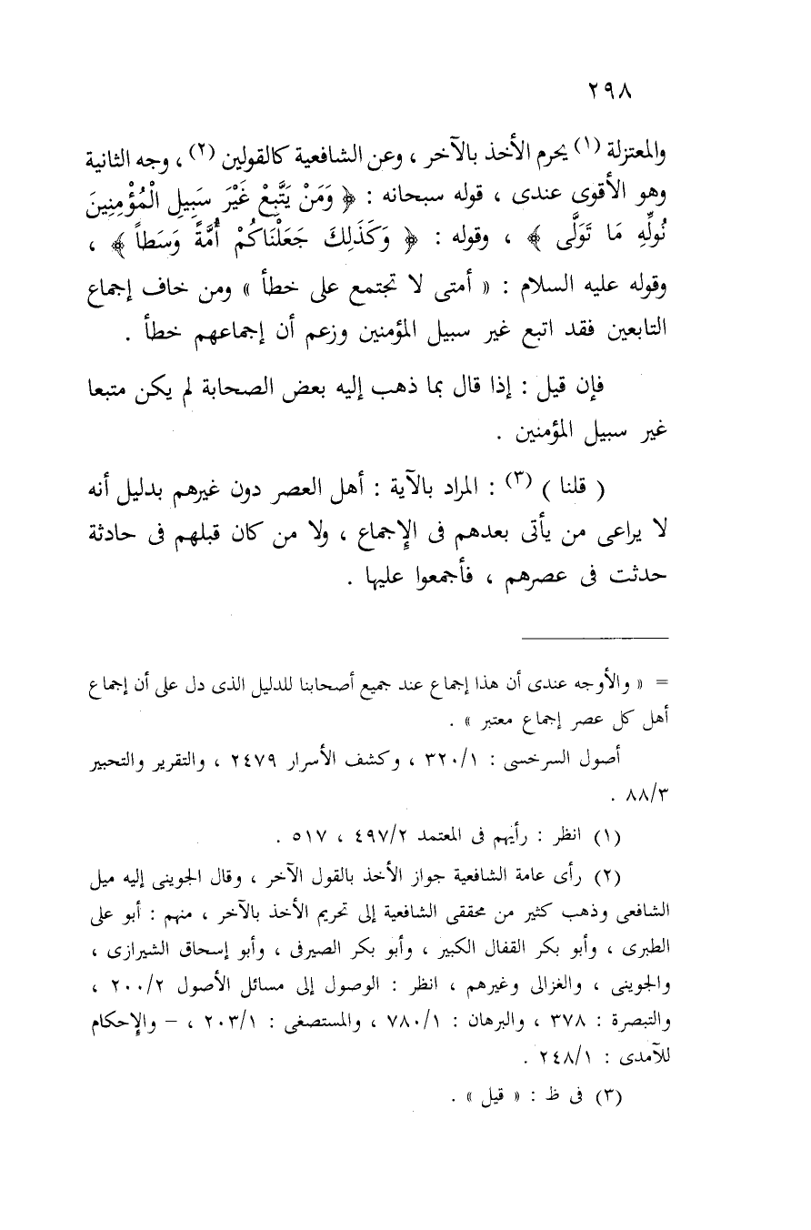 (قلنا): المراد بالآية: أهل العصر دون غيرهم بدليل أنه لا يراعي من يأتي بعدهم في الإجماع، ولا من كان قبلهم في حادثة حدثت في عصرهم، فأجمعوا عليها.