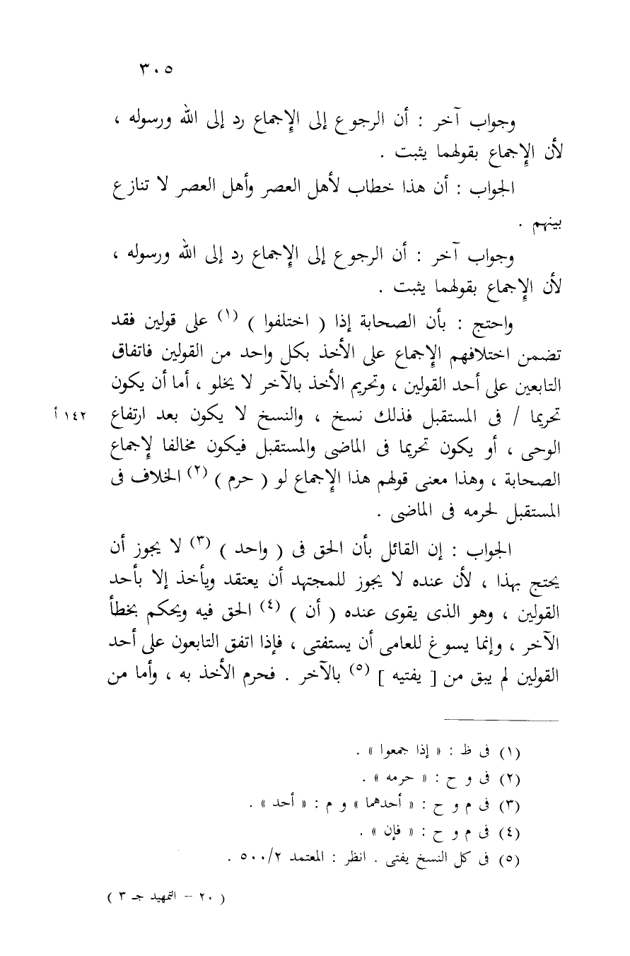 واحتج: بأن الصحابة إذا (اختلفوا) على قولين فقد تضمن اختلافهم الإجماع على الأخذ بكل واحد من القولين فاتفاق التابعين على أحد القولين، وتحريم الأخذ بالآخر لا يخلو، أما أن يكون تحريماً/ في المستقبل فذلك نسخ، والنسخ لا يكون بعد ارتفاع الوحي، أو يكون تحريماً في الماضي والمستقبل فيكون مخالفاً لإجماع الصحابة، وهذا معنى قولهم هذا الإجماع لو (حرم) الخلاف في المستقبل لحرمه في الماضي.