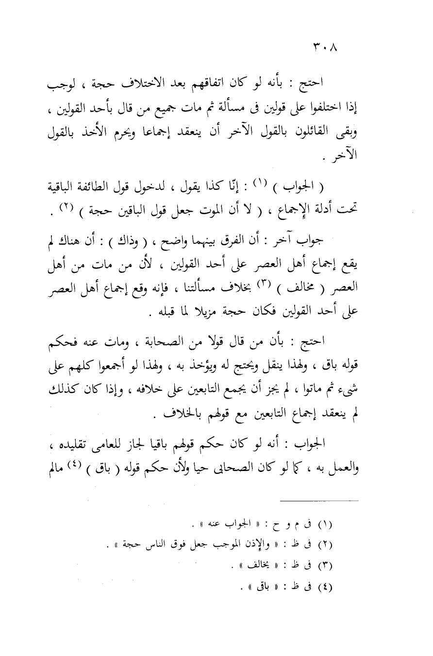 جواب آخر: أن الفرق بينهما واضح، (وذاك): أن هناك لم يقع إجماع أهل العصر على أحد القولين، لأن من مات من أهل العصر (مخالف) بخلاف مسألتنا، فإنه وقع إجماع أهل العصر على أحد القولين فكان حجة مزيلاً لما قبله.